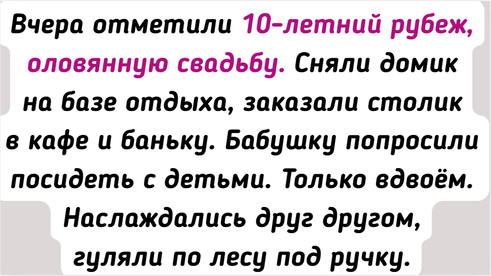 - Вчера отметили 10-летний рубеж, оловянную свадьбу. Сняли домик на базе отдыха, заказали столик в кафе и баньку. Бабушку попросили посидеть с детьми. Только вдвоём. Наслаждались друг другом, гуляли по лесу под ручку. Ночь была романтичной, как в медовый месяц. Обострённые чувства и эмоции. Счастье — когда прижимают к себе, понимаешь, что мы молоды, впереди жизнь, дети растут в любви и спокойствии, родители живы, весна за окном. © Syslikagronom