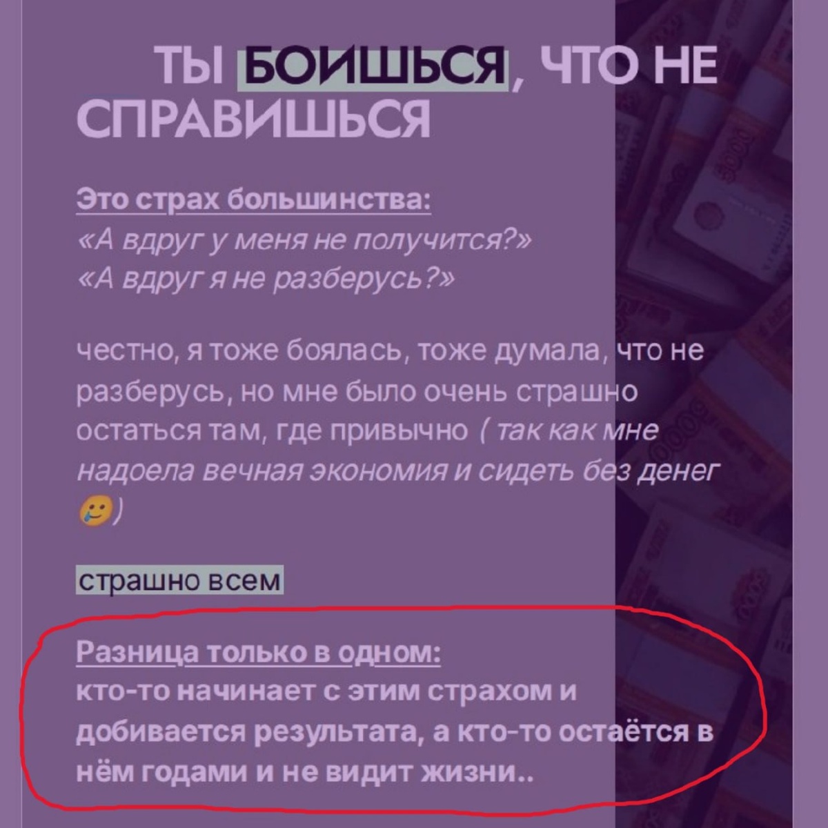? Как вы думаете? … По мне - это страх. Любой из тысячи возможных. - Страх неудачи - Страх показаться глупым - Страх потерять время, деньги, репутацию… На скриншоте – мотивационный лид-магнит, цель которого – сподвигнуть человека начать продавать. Но, блин, автор так говорит, будто бы преодолеть страхи – легко. Надо просто идти и делать. Да. Но нет. Если бы человек мог преодолеть свои страхи, он бы их уже преодолел. Просто пошел и сделал. И ему не нужен никакой лид-магнит, тем более, мотивационный. У какого-то процента людей все получается. Я восхищаюсь такими людьми! Но еще больше восхищаюсь теми, кто тысячу раз пробовал преодолеть свой страх, у него хотя и не получилось, но он не сдается. Тут нужна огромная сила духа! Когда-то все получится. Психика наша так устроена, что боится всего нового. И часть людей так запуганы с детства, что «поспешишь – людей насмешишь», «Ты? Справишься?», «Инициатива наказуема», «Наша хата с краю», что используют миллион причин, чтобы «гото