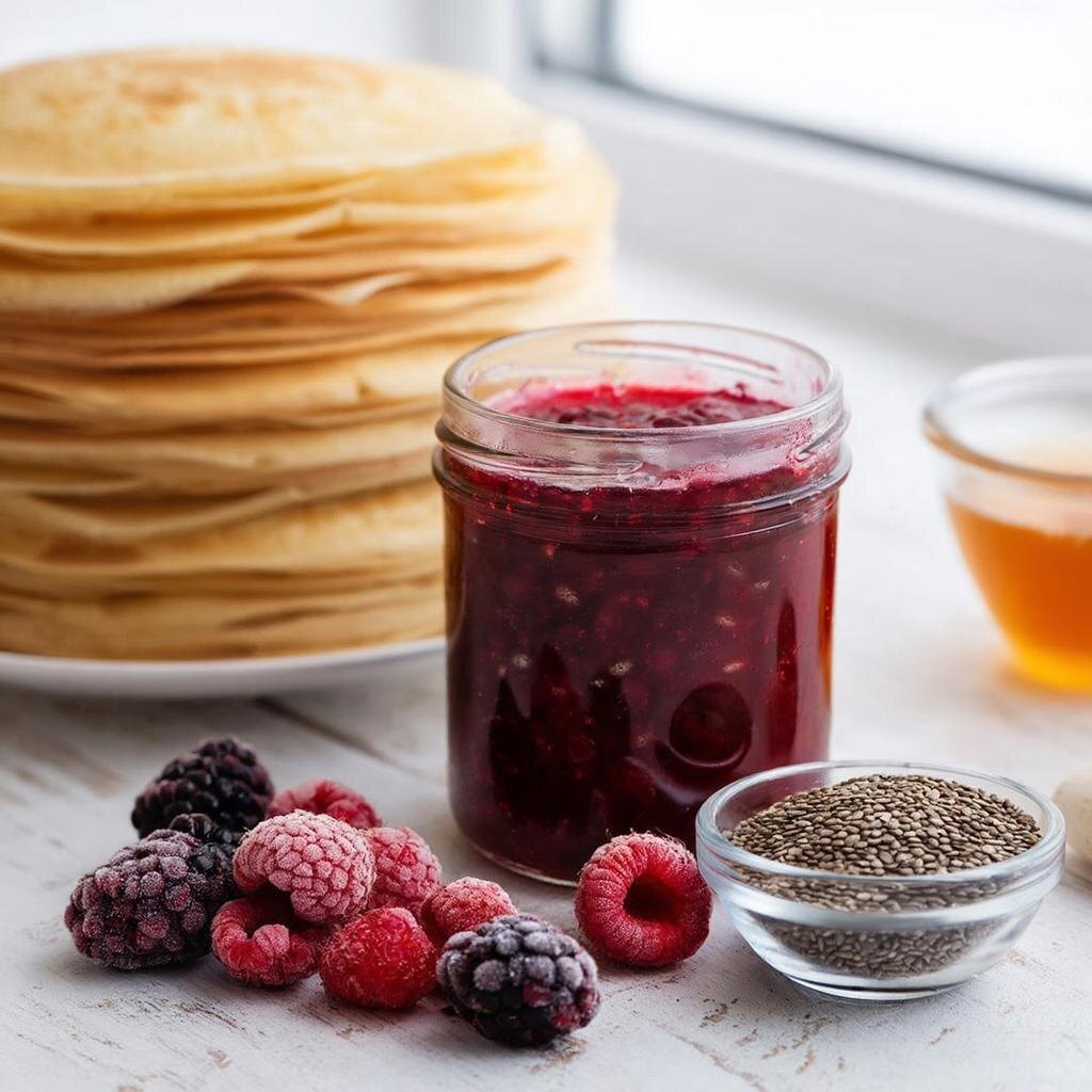 • Мёд — 1,5 ст. ложки Как готовить: КБЖУ на 100 г: ~95 ккал, Б — 1.5 / Ж — 1.4 / У — 21.1 / Клетчатка — 5.5 г Что хорошего: Если приготовить блины и джем самим - из цельных продуктов, без лишнего сахара и рафинированной муки - получим блюдо, богатое клетчаткой и нутриентами вместо пустых калорий и сожалений😉