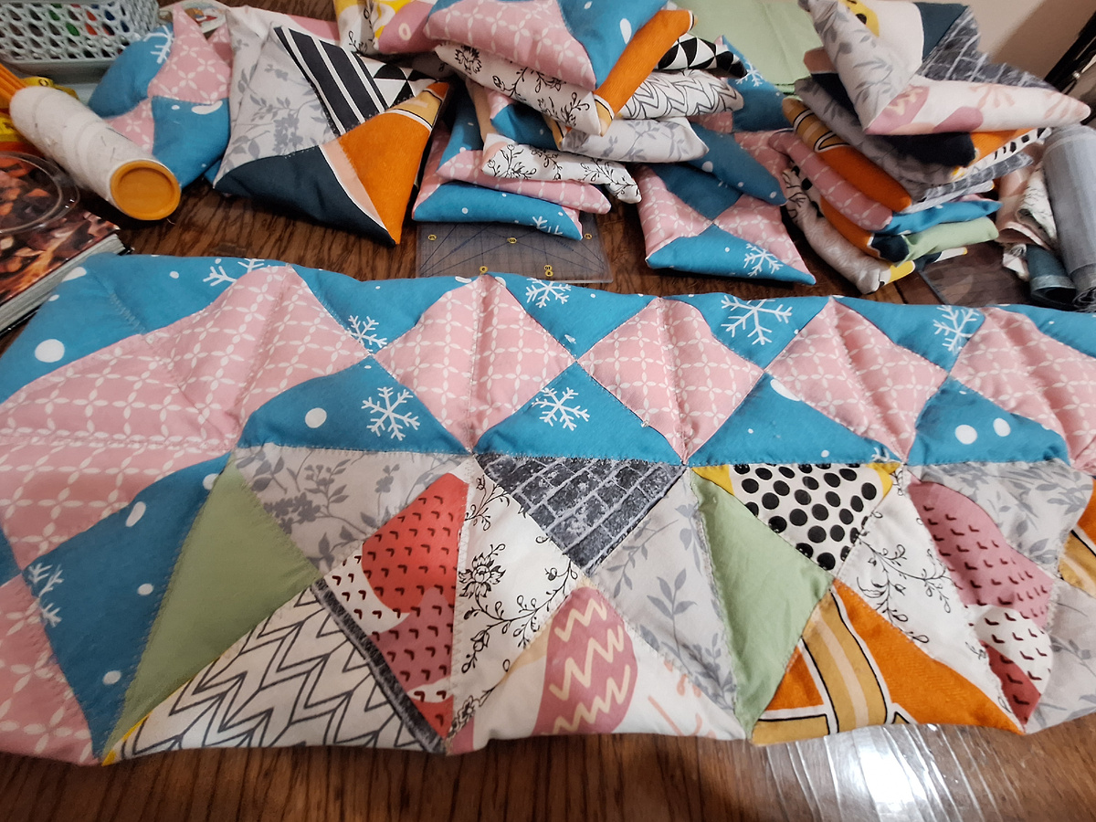 Но когда сшиваю блоки между собой, очень трудно начинать шить, блоки не хотят пришиваться ровно, то один выбъется первым, то другой. Долго думала и решила попробовать сшивать вначале немного вручную, чтобы ровно совместить два блока, вроде получилось, процесс пошёл.