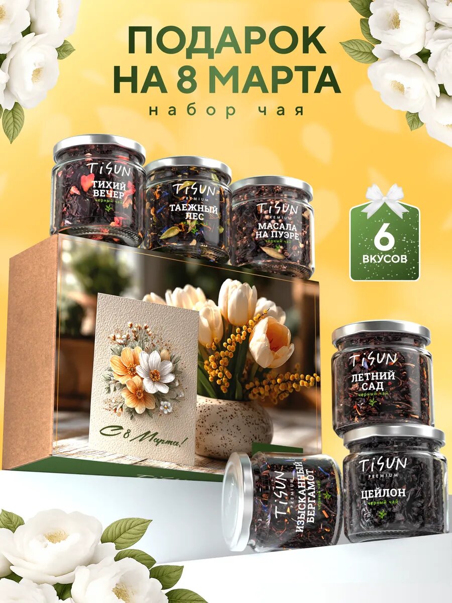 Классика, которая всегда уместна — набор листового чая TiSun в красивых баночках. Шесть вкусов: Цейлон, Бергамот, Летний сад, Масала на пуэре, Таёжный лес, Тихий вечер. Натуральный лист без пыли, ароматизаторы из сушёных ягод и фруктов. В подарочной коробке, готов к вручению.