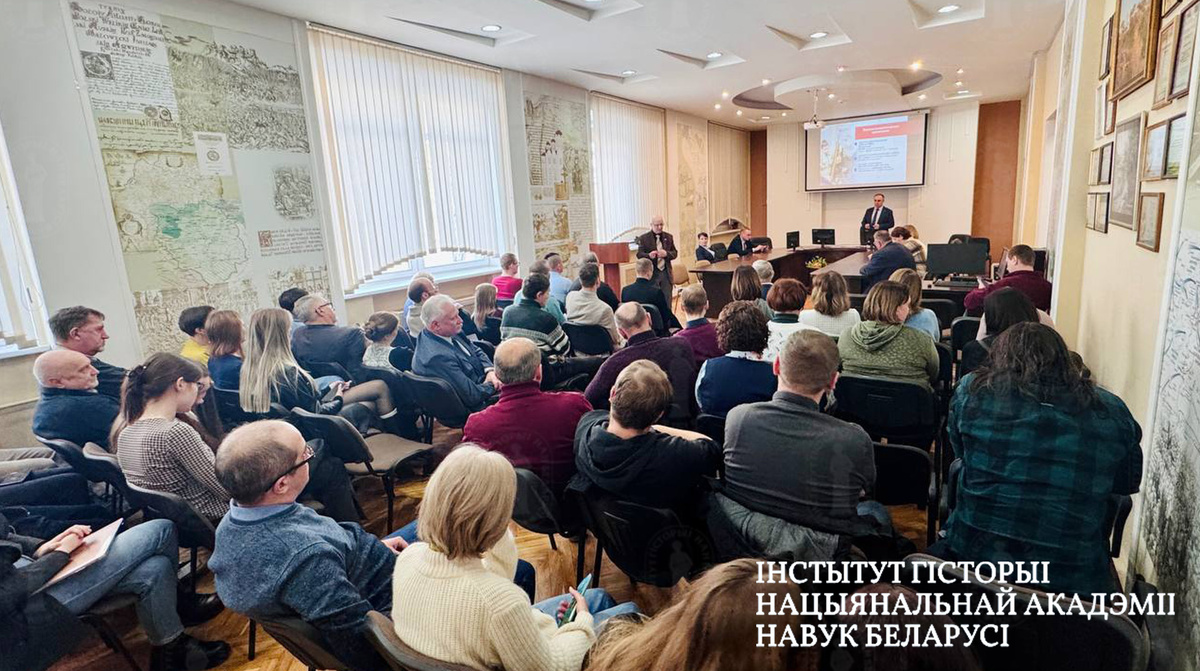 19 февраля 2026 г. в Институте истории НАН Беларуси прошел Единый день информирования на тему: «Оборонительная мощь белорусской армии и патриотизм в современных условиях». Перед учеными института выступил профессор кафедры идеологической работы и социальных наук Военной академии Республики Беларусь, эксперт по военной идеологии и национальной безопасности, кандидат педагогических наук Владимир МАКАРОВ.