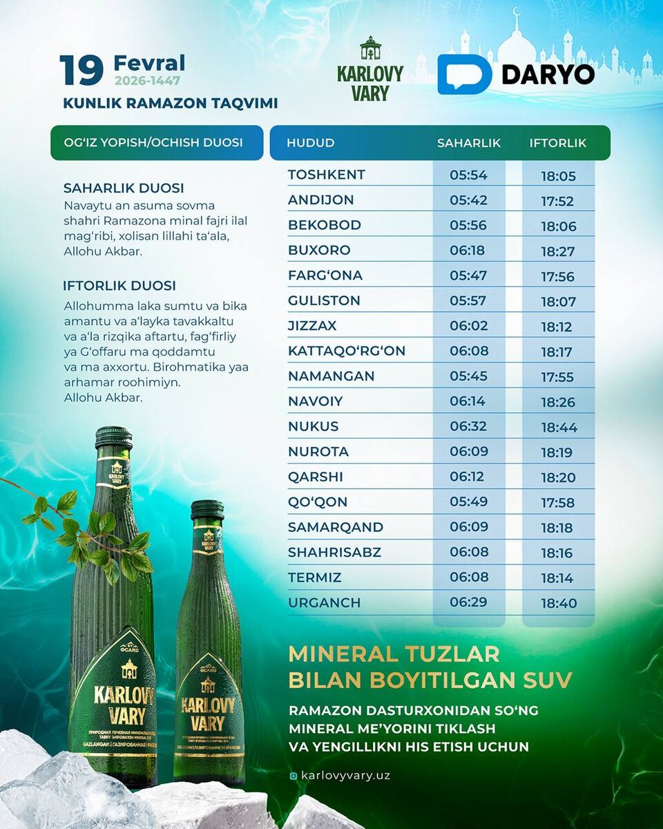 Allohumma laka sumtu va bika aamantu va a’layka tavakkaltu va a’laa rizqika aftartu, fag‘firliy ma qoddamtu va maa axxortu birohmatika yaa arhamar roohimiyn. Ma’nosi: Ey Alloh, ushbu Ro‘zamni Sen uchun tutdim va Senga iymon keltirdim va Senga tavakkal qildim va bergan rizqing bilan iftor qildim. Ey mehribonlarning eng mehriboni, mening avvalgi va keyingi gunohlarimni mag‘firat qilgil. @daryolive