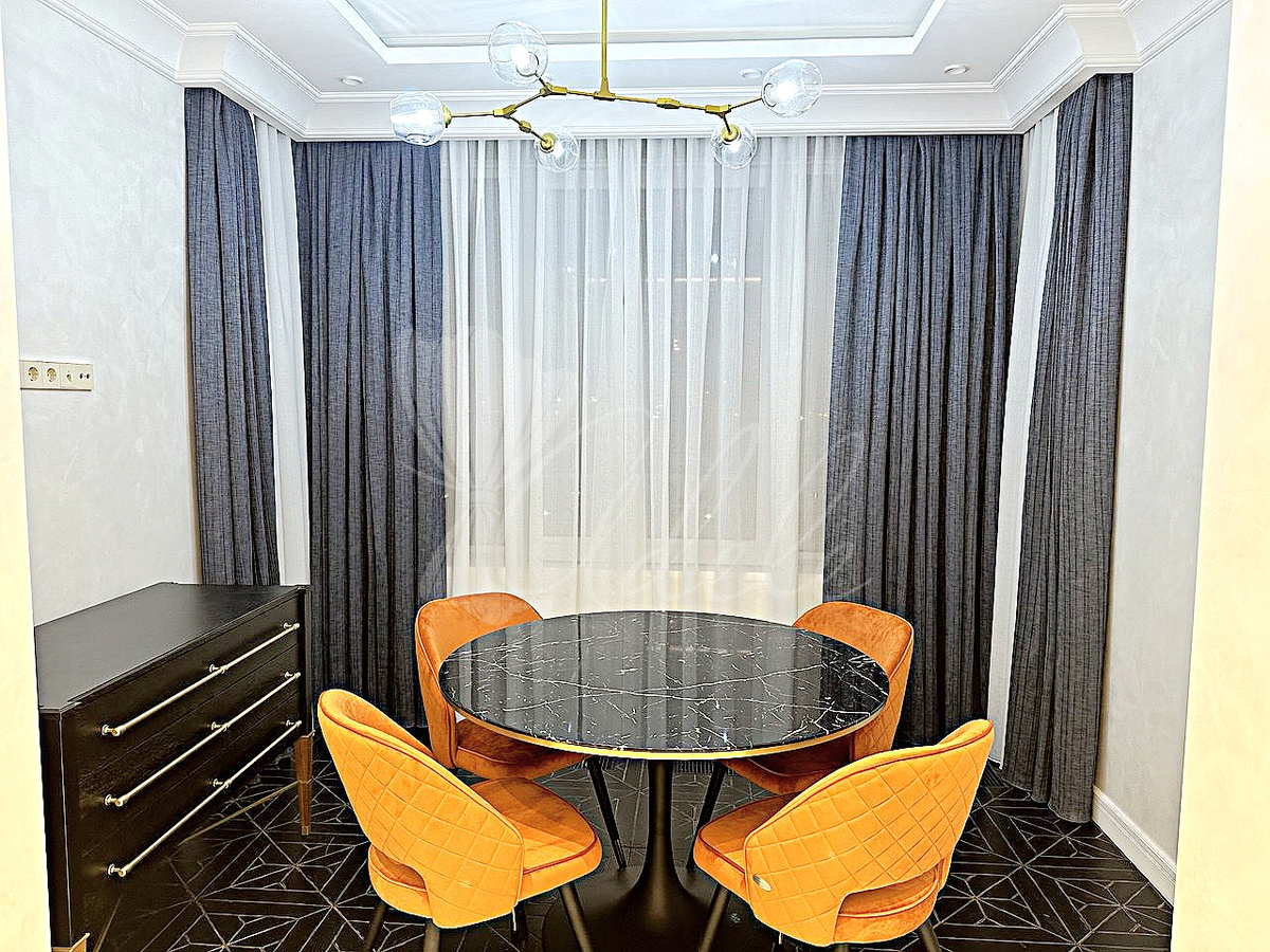 Оформление интерьера квартиры в Сочи построено на гармоничном сочетании света, приватности и интересных текстур, что особенно актуально для южного климата и насыщенного городского окружения. В столовой, где эркерное окно выходит на оживлённую улицу, было важно нейтрализовать яркое солнце, не затемняя пространство полностью. Для этого использованы рабочие шторы из однотонной ткани премиальной коллекции CHIVASSO с плиссировкой. Их пластичные складки и округлые формы подчёркивают геометрию интерьера, гармонично сочетаясь с узором напольной плитки и контрастными прожилками мраморной столешницы. Батистовый тюль с вертикальными линиями украшает центр каждого окна эркера, придавая пространству лёгкость и частично скрывая уличный пейзаж. Для удобства доступа к подоконнику и ухода за тюлем он выполнен в двух частях. В детской комнате интерьер выполнен в классическом стиле с продуманной эргономикой. Основное внимание уделено ярким шторам, которые контрастируют со светлыми стенами и мебелью, акце