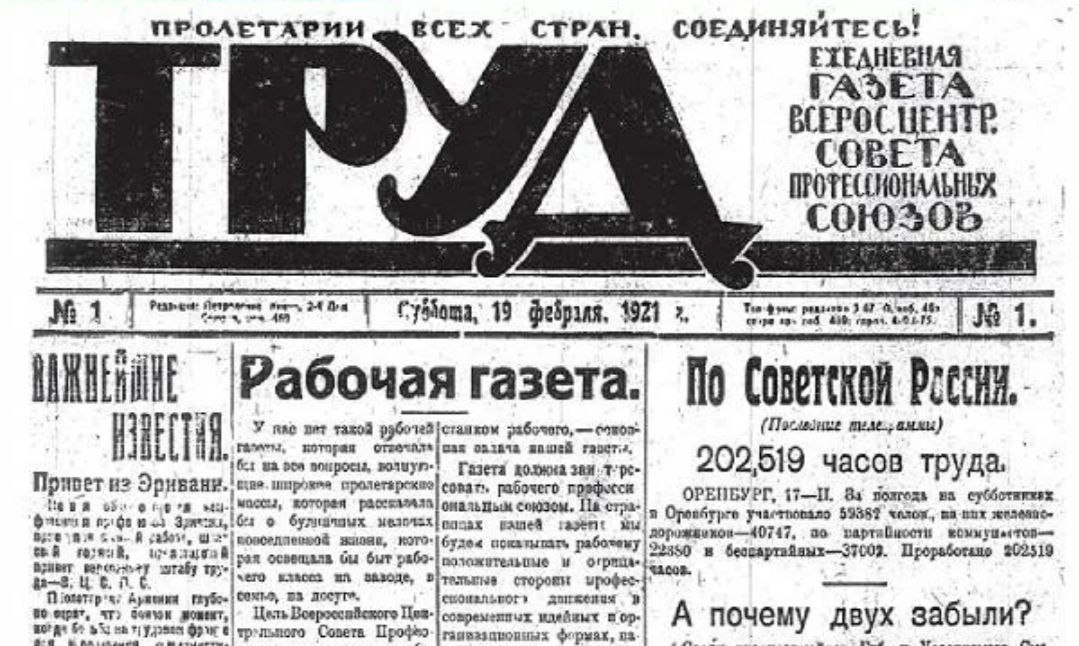 📰 ФАКТ ДНЯ: 19 ФЕВРАЛЯ 1921 ГОДА — ВЫХОД ПЕРВОГО НОМЕРА ГАЗЕТЫ «ТРУД