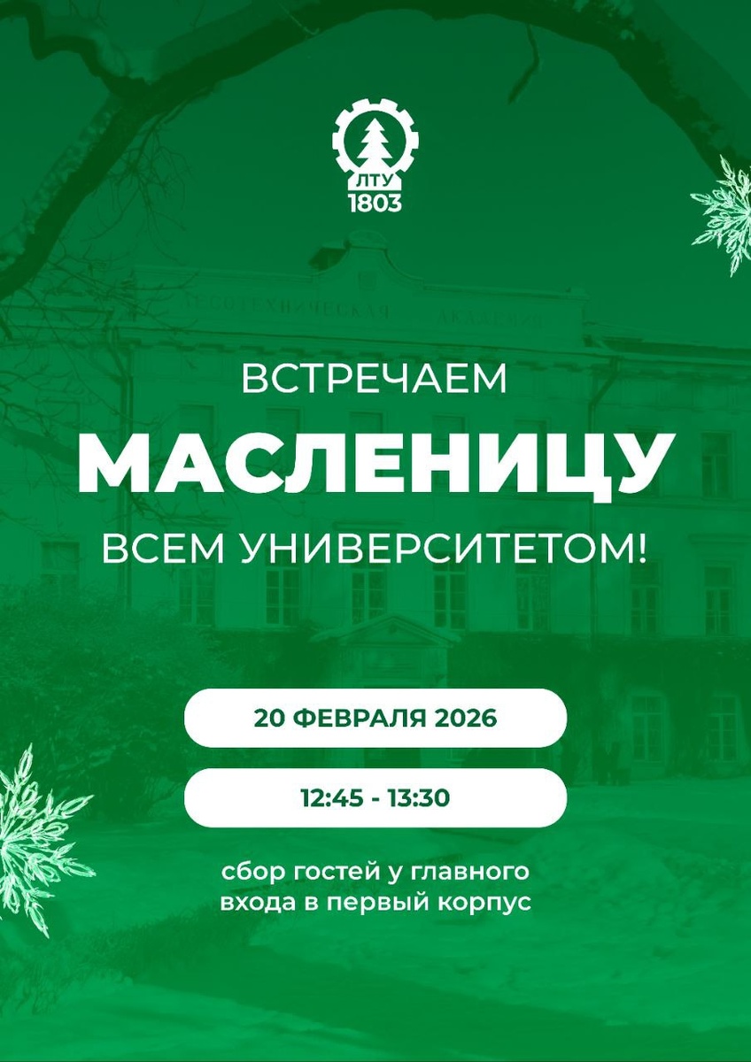 ! 20 февраля приглашаем студентов, преподавателей и сотрудников на праздничные гуляния! ✨ В программе: • творческие выступления • народные забавы и конкурсы • вкусные блины от Управления по воспитательной работе и молодёжной политике и Совета обучающихся СПбГЛТУ 📍Когда: 20 февраля • Во сколько: 12:45 • Где: главный вход в первый корпус Приходи провожать зиму весело и с блинами! 🌞 #СПбГЛТУ #СПбГЛТУ_анонс 👻 МАХ | 📲 ВК | 📝 ДЗЕН
