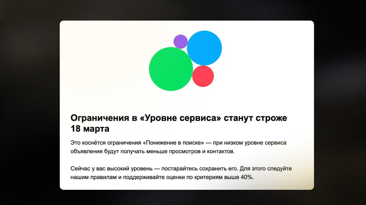 — дубли объявлений Теперь вводится более жесткое ограничение, которое понижает ваши объявления в поиске Даже если вы продвигаете свое объявление, вам придется вложить больше денег, чтобы быть наравне с теми, кто держит в норме уровень сервиса Так что будьте осторожнее, если у вас все в норме. Если нет, то постарайтесь исправить уровень сервиса до 18 марта, чтобы не просесть в трафике [1] Гайд по масспостингу: от А до Я