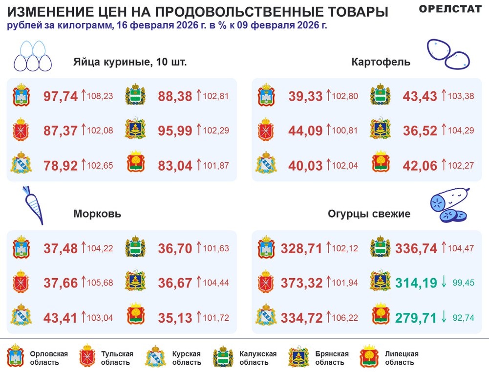 Специалисты органов статистики продолжают мониторить ситуацию с ценами в Орловской области. По данным Орёлстата, в регионе с 10 по 16 февраля выросли цены на яйца куриные на 8,2 % (средняя цена составила 97,74 руб. за дес.), морковь на 4,2 % (37,48 руб. за кг), картофель на 2,8 % (39,33 руб. за кг), огурцы свежие на 2,1 % (328,71 руб. за кг). При этом стали дешевле консервы фруктово-ягодные для детского питания на 4,9 % (477,86 руб. за кг), помидоры свежие на 4,9 % (229,07 руб. за кг), свёкла столовая на 3,2 % (34,24 руб. за кг), колбаса полукопчёная и варёно-копчёная на 1,6 % (689,02 руб. за кг). Больше новостей на regionorel.ru