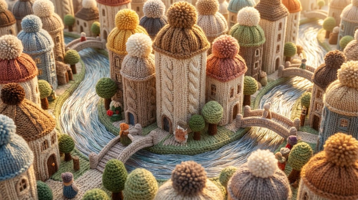 Вязаный город и цветы из шёлка. Настоящее волшебство — не в создании новых материалов, а в новом взгляде на привычные. Этот ключ — инструкция по превращению уюта в фантастику, где мягкость становится средством для строительства целых миров. 🔑 Ключ (Prompt): 1. Город из пряжи: A whimsical fantasy cityscape, entirely knitted from thick woolen yarn, with cozy cable-knit towers, pom-pom rooftops, and rivers of flowing silk thread, soft morning light, isometric view *(Причудливый фантастический городской пейзаж, полностью связанный из толстой шерстяной пряжи, с уютными башнями «косичкой», помпонными крышами и реками из струящейся шелковой нити, мягкий утренний свет, изометрический вид)* --ar 16:9 --style raw --niji 2. Цветочная феерия из ткани: A macro photo of an exotic flower, but each petal is made of delicate, hand-dyed silk with visible weave texture, the stem is wrapped in embroidered velvet, dewdrops are made of clear glass beads, studio shot on dark fabric *(Макрофотография э