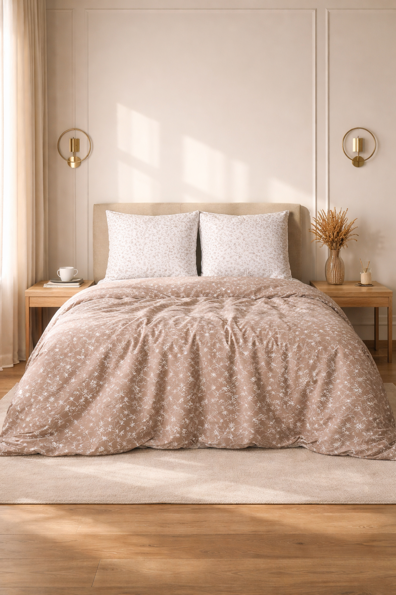 Это тот самый “тихий люкс” для спальни: спокойный бежевый тон + флористический дизайн без кричащих контрастов, из-за чего комплект легко вписывается почти в любой интерьер — от сканди до современной классики. Рисунок воспринимается как аккуратный декор, а не как “принт ради принта”. Комплект сшит из перкали (100% хлопок) — это ткань, которую обычно любят за гладкость, аккуратную фактуру и опрятный вид. Плотность 112 г/м² — комфортная “городская” плотность: бельё не выглядит тонким и не теряет форму после первых стирок, но и не становится тяжёлым или “жарким”. По ощущениям перкаль обычно чуть более “собранная” и прохладная на старте, чем сатин — особенно приятно, если в комнате тепло. При этом хлопок остаётся хлопком: дышит, не липнет, не создаёт парникового эффекта. Формат полутораспального комплекта практичный и понятный: Важно: простыня без резинки — то есть это классическая простыня, которую можно аккуратно подогнуть под матрас.