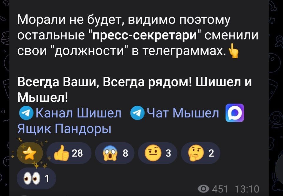 За мохрового пи*дюля Миронове, всем полагается повышение по службе. Все просто ушли на повышение, дурында. 😎 Миронова - залог удачной карьеры. Вы что, свою императрицу не читаете? Вот напишет на вас жалобу - и сразу в депутаты! Советую попробовать - работает как часы! БЬЁМ ВРАГА НА ВСЕХ ФРОНТАХ🫡 ПОБЕДА БУДЕТ ЗА НАМИ 🇷🇺