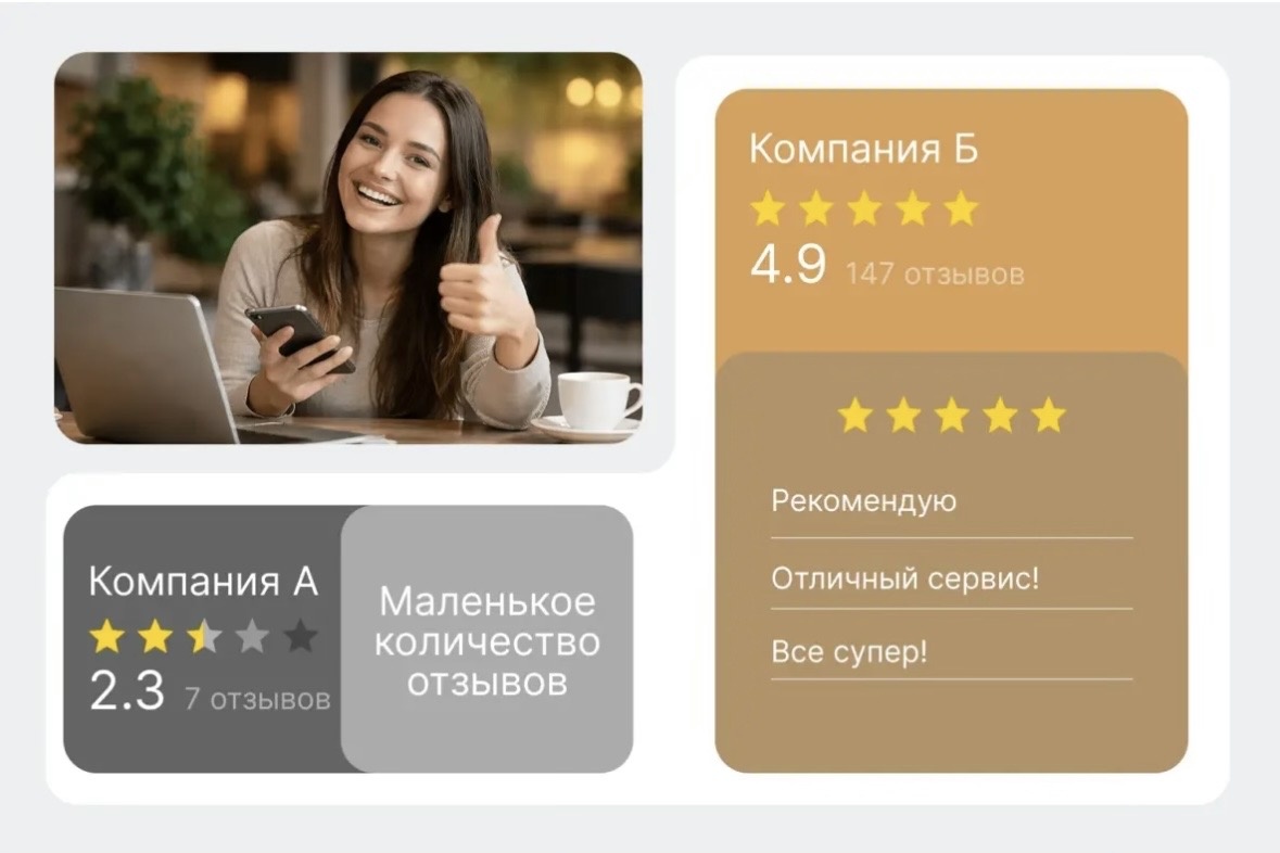 То есть, если у вас 5 отзывов, а у конкурента 50 — он забирает ваших клиентов просто потому, что их у него больше. Даже если ваш товар лучше, а сервис вежливее.