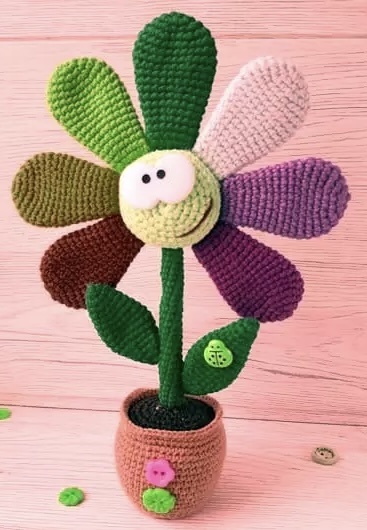 По данному описанию вы можете связать цветочек с улыбкой в горшочке крючком. Для вязания амигуруми подойдёт любая полухлопковая или хлопковая пряжа и подходящий крючок. Можно выбрать абсолютно любые цвета. Внутри игрушки можно использовать проволоку или деревянную палочку, если стебель слабо держится. Лепестки ввязываются. На дно горшка для большей устойчивости следует поместить плотный картон или пластик. Мордочку оформляем по желанию.