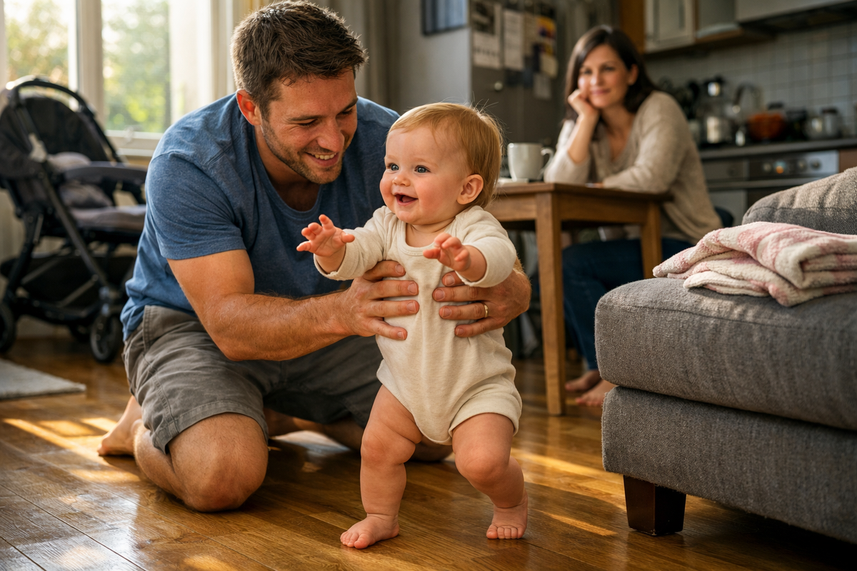 Маше было девять месяцев. Она училась ходить. Андрей возил её по комнате на руках — осторожно, смеясь, когда она пищала от восторга.
