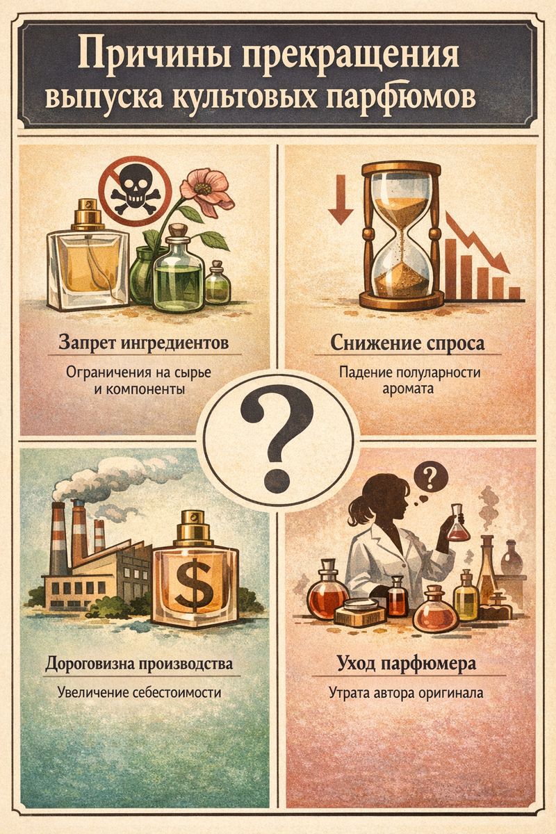 Причины прекращения выпуска культовых парфюмов могут быть разными: плохие продажи, высокая стоимость ингредиентов, моральное устаревание аромата или запреты международной организации IFRA на использование определенных натуральных компонентов (например, дубового мха или натурального мускуса) ради безопасности и экологии . В таких случаях качественный аналог становится настоящим спасением для преданных поклонников .