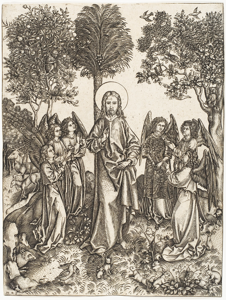 Согласно Библии (Марк 1:12-13), сразу после крещения Христос ушёл в пустыню, где оставался сорок дней в окружении диких зверей и ангелов, и искушаемый сатаной. был Он там в пустыне сорок дней, искушаемый сатаною, и был со зверями; и Ангелы служили Ему На изображении этого эпизода, созданном Master i.e. (Германия, работал в период 1480–1500), дикая природа кажется совсем не угрожающей, поскольку она населена игривыми кроликами, куропатками и другими птицами, парящими в небе, а слева бродят олень с олененком. Однако на символическом уровне олени, куропатки и кролики отсылают к греху похоти. А Сатана представлен обезьяной на яблоне слева, совой, сидящей на дубе справа, и лисой, выглядывающей из-под камней в левом нижнем углу. Эта гравюра — одна из самых впечатляющих работ художника, известного как Master i.e., о котором мало что известно. Вероятнее всего, он работал в мастерской Мартина Шонгауэра (1448-1491), чьи инициалы ошибочно указаны внизу гравюры. Даже высказывалось предположен