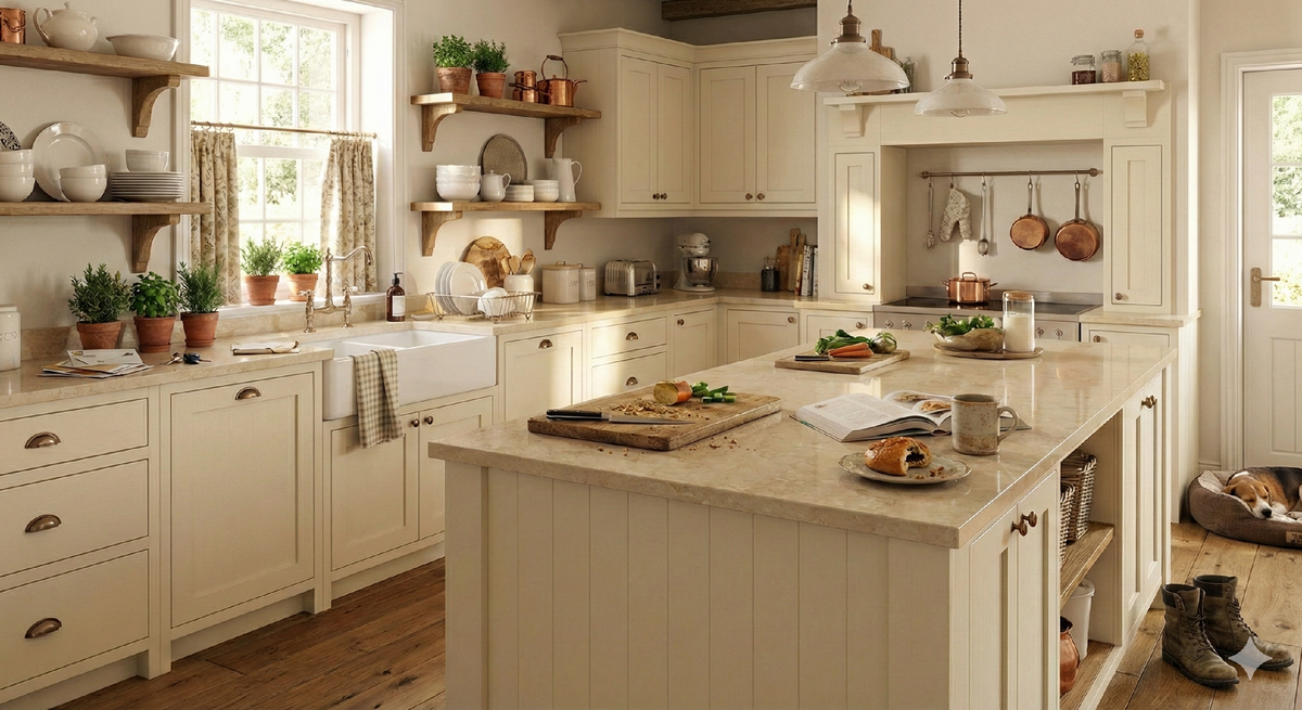 Особое место в стиле Коттедж занимает оформление рабочих поверхностей. Столешницы на кухне или в ванной комнате должны быть не только эстетичными, но и максимально практичными. Идеальным решением здесь становится кварцевый агломерат.