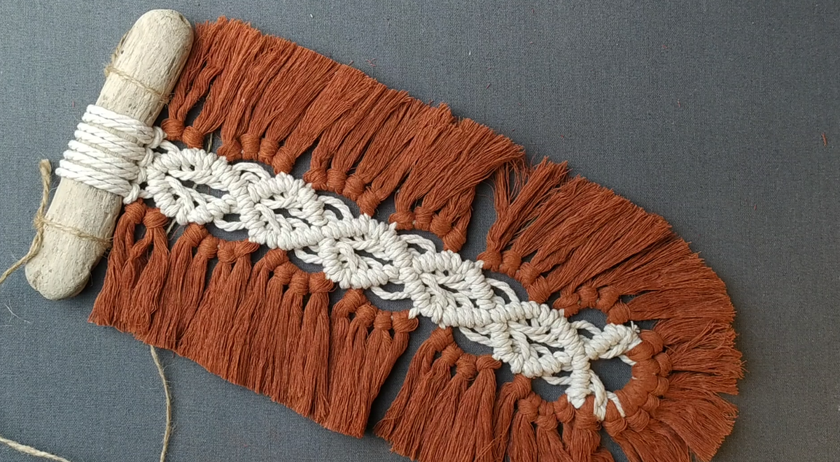 Приветствуем вас! В этом мастер-классе покажу, как сплести такое панно-листок. А подробное видео можно посмотреть по ссылке на rutube Расчёт нитей указан для панно высотой 35 см. Что потребуется: Приступим! Белые нити закрепляем на основе. Для этого нить складываем пополам, перекидываем за основание и продеваем концы в петлю. Затягиваем. Так как нити сложены пополам, в работе будет 8 концов. Будем работать двумя группами - правая и левая четверки. Делим нити пополам. Берём 2 центральные и перекрещиваем их, располагаем под углом 45 градусов. Плетём диагональный репсовый ряд, формируя верхние стороны ромба. Выполняем по 2 репсовых узелка каждой нитью. Подробный урок о репсовых узлах можно посмотреть в статье Далее переходим к узору «Окошко»: Работаем с левой четверкой: Чтобы соединить половинки ромба, держим центральные нити и на правую нить завязываем 2 узелка левой нитью. Первый ромб закончен. Плетём второй ромб аналогичным способом. Когда две половины второго ромба готовы, берём цент