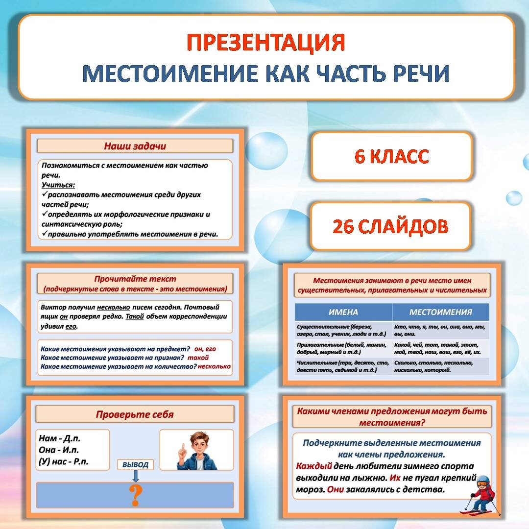 Презентацию скачать здесь Презентация «Местоимение как часть речи» разработана к уроку русского языка в 6 классе. Состоит из 26 слайдов. Данная презентация - это готовый материал для проведения урока русского языка в 6 классе. Все слайды выстроены в соответствии с этапами урока: постановка задачи, изучение новой темы, закрепление материала и подведение итогов. В основе урока лежат принципы проблемного обучения. Сначала учащиеся работают с текстами, отвечают на вопросы и самостоятельно делают выводы. Лишь после этого им предлагаются готовые определения. Методическая разработка состоит из теоретической и практической частей. К каждому заданию имеются ответы, чтобы ученики могли проверить себя. Данная презентация станет ценным помощником для учителя русского языка. Также она будет полезна для самостоятельного изучения темы, домашнего и дистанционного обучения. Желаю успеха!