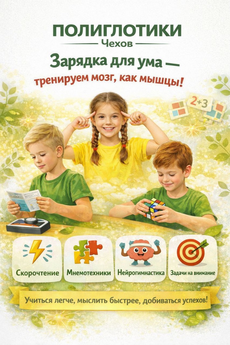 ✨ "Зарядка для ума" в Полиглотиках Тренируем мозг, как мышцы! Если ребёнку сложно концентрироваться, запоминать и быстро мыслить — мозгу нужна регулярная тренировка. На новом курсе мы будем развивать логику, память и мышление через: ⚡ скорочтение 🧩 мнемотехники 🤸 нейрогимнастику 🎯 упражнения на внимание и мышление Такие занятия помогают детям учиться легче, быстрее обрабатывать информацию, увереннее отвечать и показывать лучшие результаты. 🚫 Возраст: 6+ 🏢 Языковой образовательный центр "ПОЛИГЛОТИКИ" 📍 г. Чехов, ул. Уездная, д. 2 🔗 Оставить заявку: https://t.me/PoliglotikiChekhov 🌟Соц.сети: 🔥https://vk.com/poliglotikichekhov 🔥https://dzen.ru/id/65d5ffd4021a5d4953ccf615 ⭐Поддержать канал голосом ✅ Мероприятия Чехов https://dzen.ru/id/66cc4b48e9ef144699238a51 http://vk.com/chekhov_events http://dzen.ru/chekhov_events