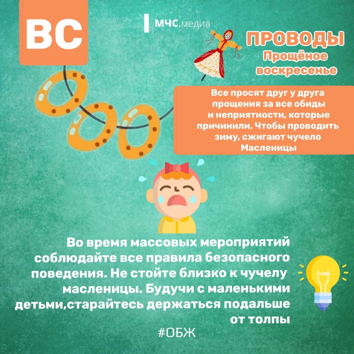 ❗Вот рекомендации от МЧС России, чтобы безопасно и без происшествий сжечь чучело: 1. Площадка для проводов должна находиться на расстоянии 50 метров от зданий, деревьев и проводов. 2. Не используй бензин и другие легковоспламеняющиеся жидкости. 3. Не оставляй детей без присмотра у огня. 4. При сильных порывах ветра откажись от затеи с костром. 5. До начала обряда подготовь первичные средства тушения: как минимум под рукой должно быть ведро с водой или песком. 6. После прощания с зимой обязательно залей пепелище водой, чтобы тление полностью прекратилось.