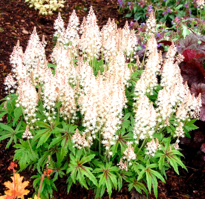 Миксбордеры и клумбы: В сочетании с другими тенелюбивыми растениями, такими как хосты, папоротники, астильбы, гейхеры и бруннеры, тиарелла создает гармоничные и многослойные композиции. Ее воздушные соцветия прекрасно контрастируют с более плотными формами листвы других растений.