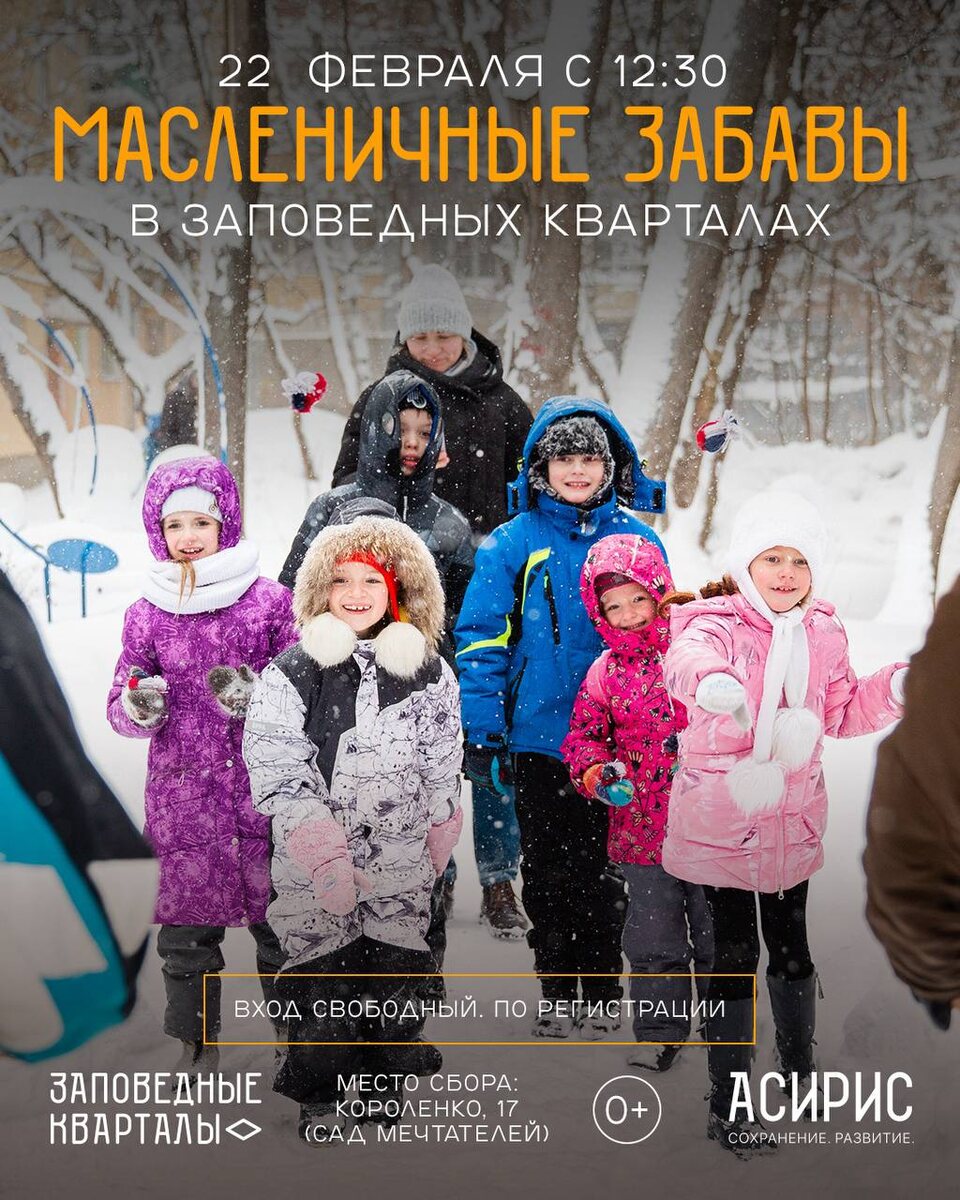 «Масленичные забавы в Заповедных кварталах» — не просто гуляния, а живая традиция игр и обрядов, в которые играли наши прабабушки и прадедушки. Вас ждут задорные хороводы и подвижные народные игры, живое исполнение народных напевов, остроумные миниатюры про тёщу и зятьёв, обряд «поворота солнышка на весну» — символическая встреча тепла и света, уютная фотозона во дворе исторических домов. Программа дня: 11:00 — экскурсия по кварталу «Обереги старинных домов» 12+ 12:30 — программа «Масленичные игры в Саду мечтателей» 0+ Вход свободный, по регистрирации: ➡️ на экскурсию ➡️ на гуляния Короленко, 17 😄 Мероприятия Нижний Новгород. Я местный! 📱 Telegram | 📲 MAX