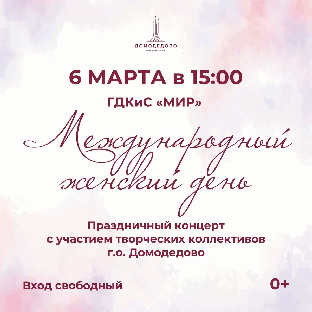 ✨ Праздничный концерт, посвящённый Международному женскому дню!💐 Вас ждут тёплая атмосфера, весеннее настроение, праздничная фотозона и яркие выступления творческих коллективов городского округа Домодедово!✨ 🚫 Возраст: 0+ 📆 06.03.2026🕒15:00 🏢 Дворец культуры и спорта «Мир» 📍 г. Домодедово, Каширское шоссе, д.100А 💰 Вход свободный❗️ ✅ Мероприятия Домодедово https://dzen.ru/id/66f10385cc4c5a16f7b5fb02 http://vk.com/domodedovo_events http://dzen.ru/domodedovo_events