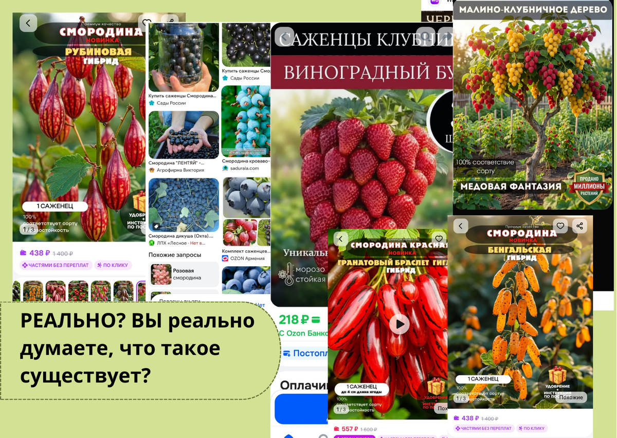 Видели эти объявления на маркетплейсах: смородина в форме сердечек, «мраморная полосатая», неоново-бирюзовая, «клубника гроздьями как виноград», «дерево, на котором одновременно растут малина и клубника». Картинки такие идеальные, что рука тянется нажать «купить» — вдруг это правда новая селекция, просто мы отстали от жизни?