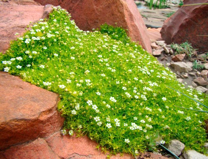 Альпийские горки и рокарии: Ее низкорослость и способность плотно покрывать почву делают ее идеальным заполнителем между камнями. Она создает эффект естественного, мшистого покрова, смягчая строгие линии камней.