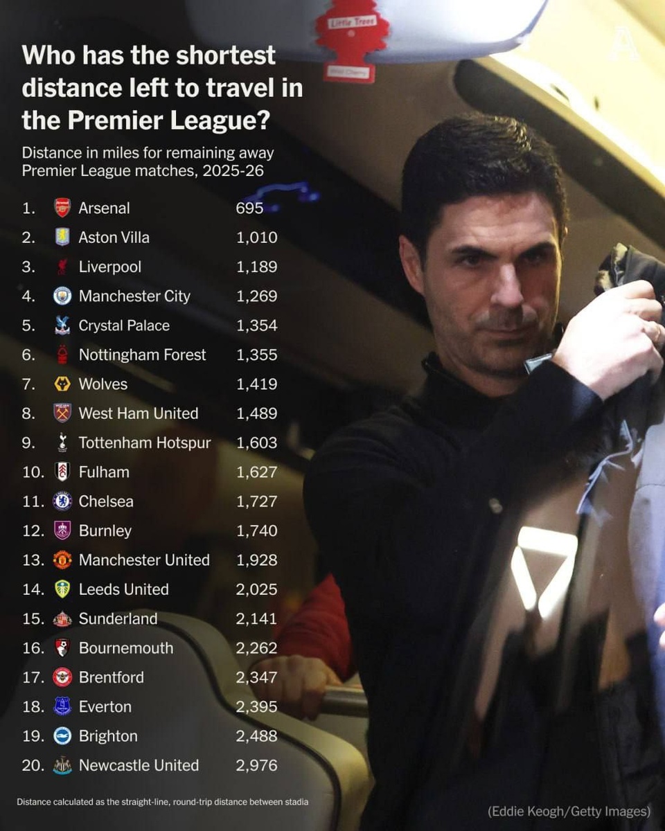 ! На графике указано сколько кому осталось поездить по стране на матчи АПЛ. Арсеналу предстоит лишь дважды покинуть Лондон за оставшиеся 11 игр. 6 из них будут дома. Выездные матчи придется сыграть на юге в Брайтоне и против Ман Сити. А ведь совсем недавно всё это могло быть не важно - только посмотрите как быстро расстаяло их преимущество: 7 февраля: «Арсенал» опережает «Сити» на ДЕВЯТЬ очков 12 февраля: «Арсенал» опережает «Сити» на ПЯТЬ очков 18 февраля: «Арсенал» опережает «Сити» на пять очков, но у «Сити» есть матч в запасе, так что потенциально - ДВА очка! ⚽️ Подписывайтесь на нас в MAX
