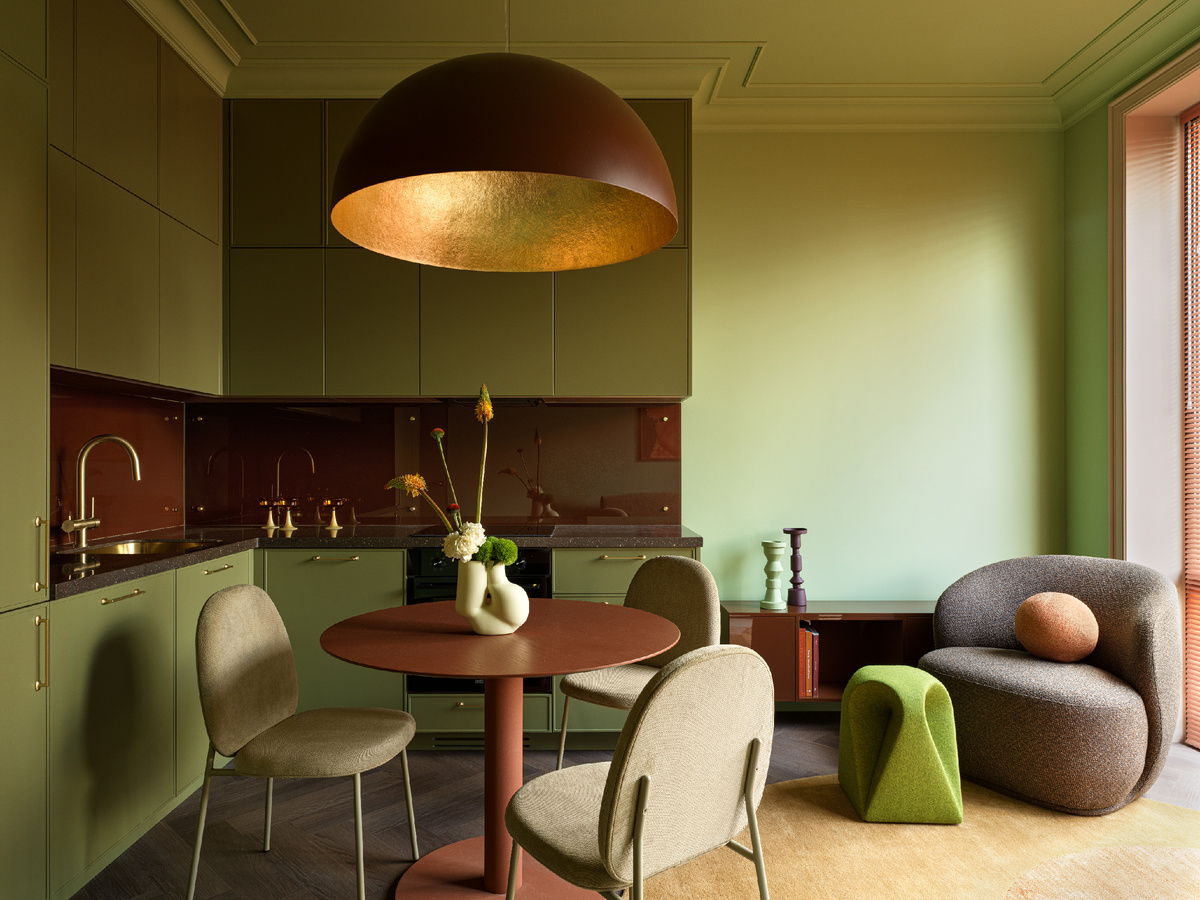 В интерьере кухни внимание сразу привлекает гарнитур в потолок. Оливковые фасады эффектно оттеняют винный фартук из тонированного стекла и полукруглый подвесной светильник над обеденным столом.