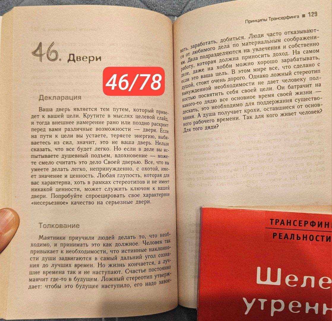 46/78 Практикум управления реальностью - Трансерфинг Двери "Ваша дверь является тем путем, который приведет к вашей цели. Крутите в мыслях целевой слайд, и тогда внешнее намерение рано или поздно раскроет перед вами различные возможности - двери." "Если в деле вы испытываете душевный подъем, вдохновение - можете смело считать это дело своей дверью. Все, что вы умеете делать легко, непринужденно, с охотой, имеет значение и ценность. Любая глупость, которая для вас характерна, хоть в рамках стереотипов и не имеет никакой ценности, может служить ключом к вашей двери. Попробуйте спроецировать свое характерное "несерьезное" качество на серьезные двери." "Люди часто отказываются от любимого дела по материальным соображениям. Дела подразделяются на увлечения и собственно работу, которая должна приносить доход. На самом деле даже на хобби можно хорошо зарабатывать, если это ваша цель. В этом мире все, что сделано с душой, стоит очень дорого. Однако ложный стереотип вынужденной необходимос