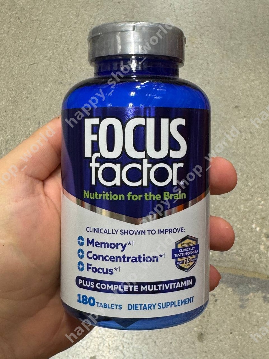 +✈️ Focus Factor — комплексная добавка для поддержки работы мозга, сочетающая полноценный мультивитаминный комплекс с запатентованной смесью ноотропных компонентов (640 мг), включающей DMAE, фосфатидилсерин, бакопу, DHA из рыбьего жира, GABA, винпоцетин и экстракт черники. Содержит полный спектр витаминов и минералов в высоких дозировках (витамины группы B, C, D, E, магний, цинк, селен, хром) для поддержки когнитивных функций: памяти, концентрации и фокуса. Клинически протестированная формула с 25-летним опытом применения. В упаковке 180 таблеток (45 порций по 4 таблетки в день), содержит рыбу и сою. ✏️Для заказа пишем 👉🏻@ksenya_charme