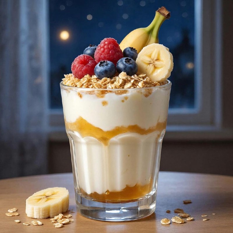 ” На прошлой неделе был вкусный десерт. Сегодня похожий ночной вариант. Представьте себе: теплый летний (это образ и сезон не важен) вечер плавно перетекает в ночную тишину, а ваш животик просит чего-нибудь лёгкого и успокаивающего. Именно тогда на сцену выходит волшебник всех десертов — «Сонный крем в стакане». Начинаем мы с нежнейшего греческого йогурта или бархатистого творожка, которые растают во рту и медленно погружают вас в состояние умиротворённости. Если душа жаждет чуть больше радости, добавляем капельку меда — её тонкий аромат создаст иллюзию домашней печки и любимых бабушкиных рецептов. Затем ложечка душистой овсянки, которая словно мягкая перинка обернет вас заботливым объятием и даст сигнал телу готовиться ко сну. Немножко корицы или нежной ванили придадут нашему лакомству особый шарм и мгновенно перенесут вас туда, где царит домашний уют и покой. Финальный аккорд — свежие ягоды или тоненькие ломтики ароматного банана, каждый кусочек которых станет маленькой искрой у