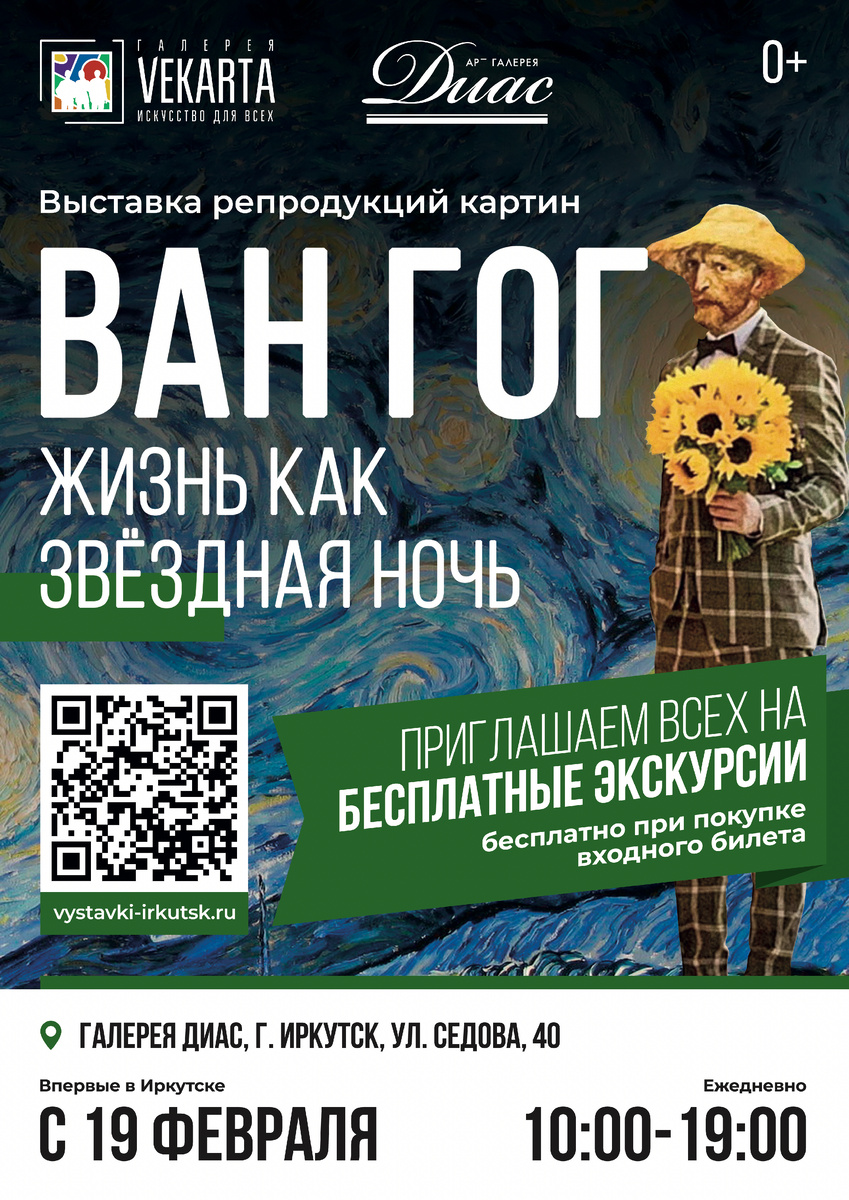 Масштабная выставка, посвященную творчеству Винсента Ван Гога (0+), открывается 19 февраля в иркутской арт-галерее «Диас». Проект от Всероссийской выставочной компании VEKARTA «Ван Гог. Жизнь как Звёздная ночь» станет первым в городе опытом знакомства с работами художника в формате художественных репродукций, выполненных в технике жикле — музейном стандарте печати, позволяющем максимально точно передать цвет и фактуру оригинальных полотен. Экспозиция объединяет более 70 произведений и построена как художественное путешествие по жизни Ван Гога — от ранних, сдержанных по цвету работ, до ярких и эмоциональных полотен последних лет. Выставка разделена на три смысловых этапа, отражающих ключевые периоды его творчества: ранние годы, время работы в Арле и финальный период, связанный с Сен-Реми и Овером. Пространство экспозиции дополнено бесплатными экскурсиями, ароматическими акцентами для отдельных картин и тематическими фотозонами, создающими атмосферу полного погружения, а также сувенирной