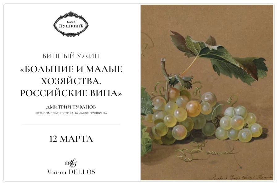 » 12 марта в 19:00 Дмитрий Туфанов — шеф-сомелье, расскажет о российском виноделии, представленном в больших и малых хозяйствах! Специально для винного ужина в ресторане «Кафе Пушкинъ» будет подано уникальное игристое вино от «Галицкий и Галицкий», выпускаемое под заказ. Специально для винного Забронировать билет.