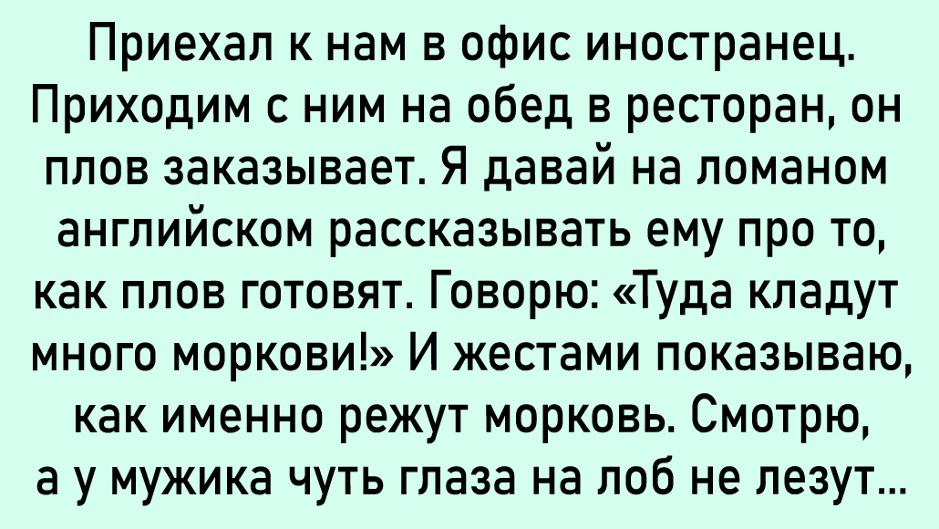 Занятные истории и неловкие моменты подстерегают нас везде — в такси, магазине, на работе, и, конечно, в заведениях общепита. У посетителей кафе и ресторанов найдется немало баек из зала, а у официантов и поваров — рассказов о том, что подчас происходит на кухне. Пошли мы с бывшим парнем как-то в ресторан. А там — акция, нам сделали неплохую скидку. Потом — бац! Дарят сертификат на несколько бесплатных доставок. Ну круто же! Вернулись из ресторана, а на парне лица нет. Спрашиваю, мол, в чем дело? Оказалось, что рестораном владеет его бывший одноклассник, который учился на тройки и даже школу не закончил. Работаю поваром, у нас кафешка маленькая, поэтому на кухне нас всего трое: я и еще двое парней. Один из них стоит на японской кухне, другой на пицце. Они все время соревнуются, кто быстрее доделает заказы. Чтобы победить, они пакостят друг другу постоянно. Сегодня один из них что-то сделал другому, а тот взял перец чили и обмазал лицо первого. А первый засунул ему в рот этот перец. Вот