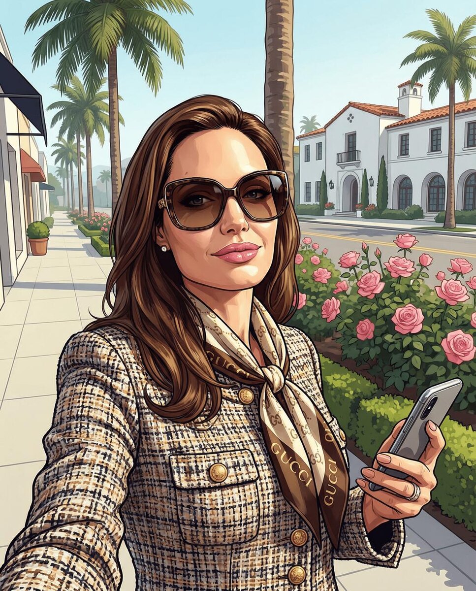 Модель: Nano Banana Сгенерировать🪄 Используй лицо с загруженного фото. Девушка в дизайнерской одежде, с большими очками и самовлюблённым выражением — как на селфи. Она выходит из бутика в районе Vinewood. Фон: пальмы, чистые тротуары, розовые кусты, белые особняки. Стиль: сочный, яркий и чистый свет, как в сценах богатых районов GTA V, ультрареалистичная текстура кожи и тканей, глянцевая эстетика.