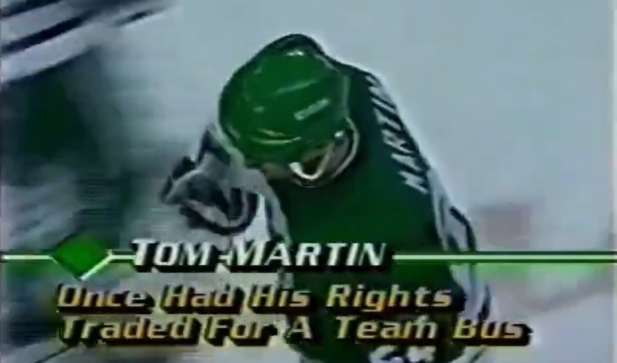, расскажу вам один занятный случай и напомню про другой Том Мартин (род. 11 мая 1964, Келоуна, Британская Колумбия) был задрафтован «Виннипег Джетс» в 4-м раунде (74-й номер) на драфте НХЛ 1982 года. До НХЛ он добрался несколько позже, а 19 января 1983 года клуб «Сиэтл Брейкерс» (Seattle Breakers) из WHL обменял права на юниорского игрока Тома Мартина команде «Виктория Кугарс» (Victoria Cougars) на их подержанный командный автобус. После этого обмена Мартин получил прозвище «Басси» (Bussey). Сам Мартин с юмором отнёсся к ситуации, заявив: «Может быть, у этого автобуса были лучшие колёса, чем у меня». Мартин провёл в НХЛ всего 92 игры за три клуба: «Виннипег Джетс» (1984–87) «Хартфорд Уэйлерс» (1987–90) «Миннесота Нор Старс» (1990–91) За карьеру набрал 12 голов и 11 передач. Основную часть карьеры провёл в АХЛ. Да и стоит напомнить, что до середины девяностых годов игроков в НХЛ меняли, в том числе, на деньги — проще говоря, покупали, как рабов. Напомню, что Криса Дрэйпера когда-то