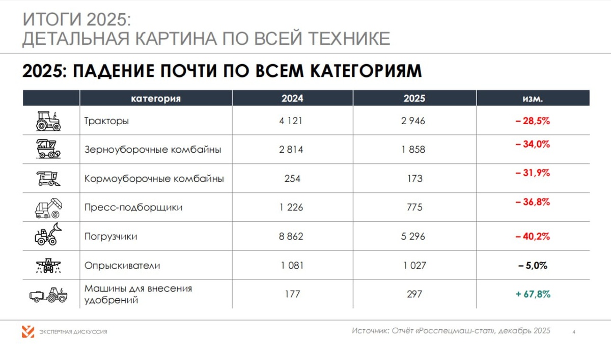 Правления Ассоциации "АСХОД" Владимир Шестак. 👉 Вот некоторые тезисы из его доклада на мероприятии АСХОД «Сельхозтехника на грани: анатомия кризиса»: ▪️Сокращение рынка российской сельхозтехники стало критическим — за последние два года минус 46% по тракторам и 56% по комбайнам: фактически, мы потеряли половину отгрузок; ▪️Рынок импортной техники также сокращается — но это не победа импортозамещения: продажи зарубежных производителей в РФ в 2024-2025 году просели на те же 40-50%, что и рынок отечественной техники; ▪️Критическое устаревание парка уже очевидно: наблюдается физическая нехватка 62 тыс. тракторов и 34 тыс. комбайнов: — Чтобы закрыть эту потребность при нынешних темпах, потребуется 20-25 лет. Но техника столько не живет. Техника умирает быстрее, чем парк обновляется. ▪️Энерговооруженность российского АПК — 1,5 л.с./га. Это в 2 раза ниже, чем в США (3 л.с./га) и в 3 раза ниже, чем в Евросоюзе (4-5 л.с./га); ▪️Кадровый дефицит в АПК составляет 160 тыс. человек в год —