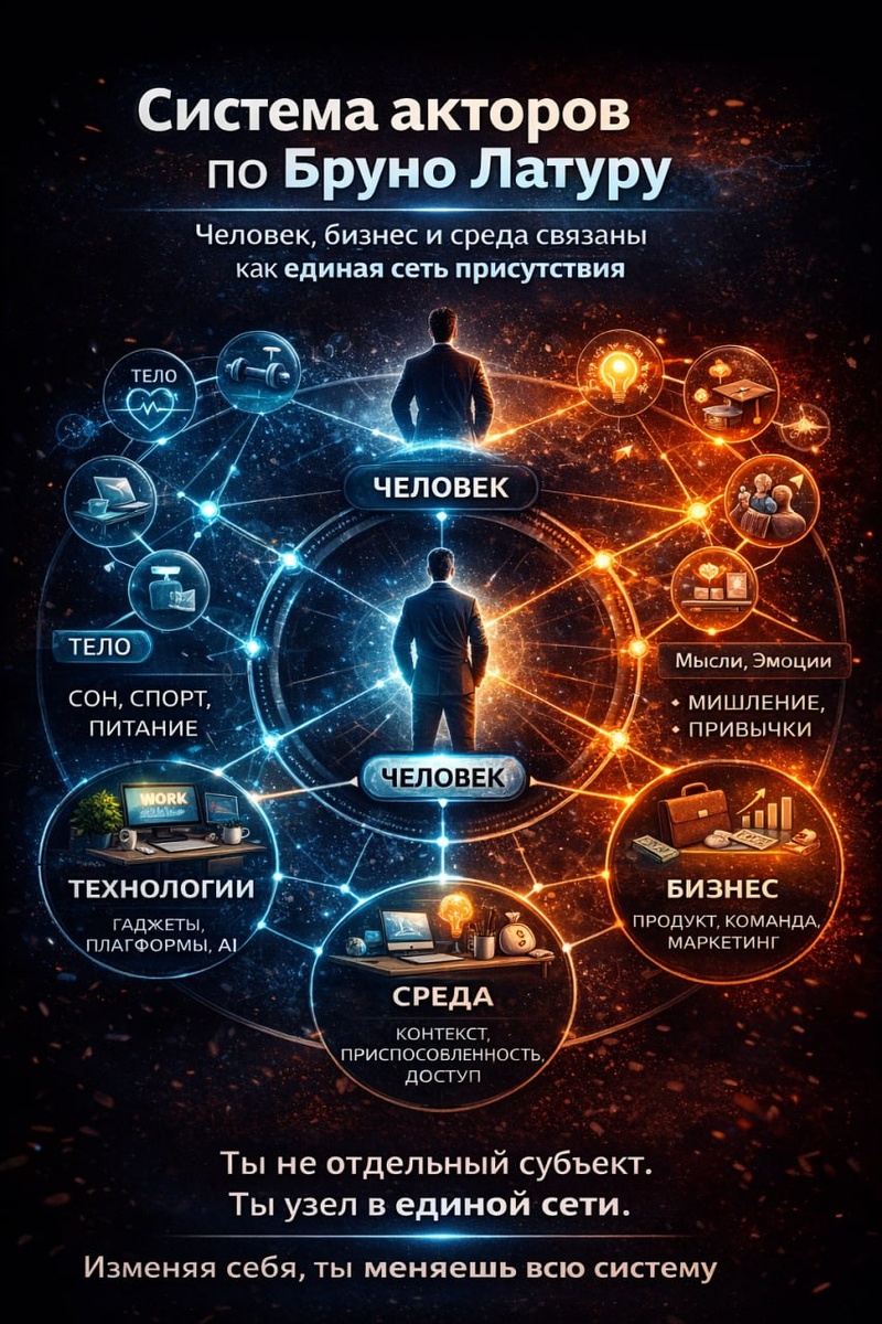! Инфографика особенно удалась) Система акторов Бруно Латура — это ядро его актерно-сетевой теории (ANT, Actor-Network Theory), которая радикально меняет представление о том, как устроена реальность, действие и социальность. Если коротко: всё, что действует — актор, и общество — это не фон, а сеть взаимодействий этих акторов . 🔹 1. Главная идея: «Действие распределено» Латур говорит: > Не существует единого субъекта, который “делает” действие. > Любое действие — это результат связи многих акторов. 📌 Актор — это любая сущность, которая что-то делает, то есть влияет на других. Это может быть: человек, вещь, технология, идея, текст, закон, бактерия, даже алгоритм или платформа. Каждый из них имеет свою агентность — способность производить эффект. 🔹 2. Акторно-сетевая структура Мир по Латуру — это сеть отношений. Никаких «высших» структур (типа “общества”, “государства” или “рынка”) не существует сами по себе — только динамические связи акторо, которые и создают то, что мы