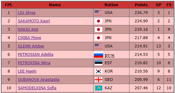 Такие вот итоги у женщин. Как я и предполагал, гораздо более предсказуемые, чем у мужчин. Прежде чем перейти к подробному обзору, небольшое резюме. В Топ-10 лишь одна неожиданность - вместо Изабо Левито мы здесь видим постепенно набирающую авторитет в Мире ИСУ Софью Самоделкину. Топ-6 полностью совпадает с предстартовым прогнозом, но чемпионкой при этом стала Алиса Лью, которая взяла за правило на всех подряд важных турнирах оказываться впереди фигуристок из Японии, в каком бы количестве они не оказывались рядом. Каори Сакамото и Ами Накаи прекрасно начинали свои программы, но в дальнейшем совершили по одной грубой ошибке, несовместимой с золотой медалью. В прокате нашей красавицы-чемпионки Аделии Петросян все свелось к борьбе с четверным тулупом. Был шанс, что он получится, однако, судя по тренировкам, не самый высокий. Исполни чисто тулуп и не Ами Накаи, а Аделия была бы на фото выше с бронзовой медалью, но не сложилось...