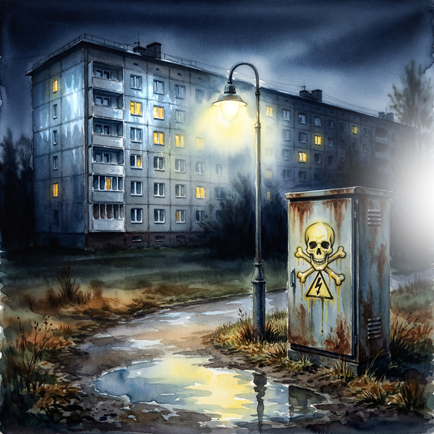 У поворота, прямо у тропинки, стоял трансформаторный ящик. Ржавый, облупившийся, но на боку его кто-то давно нарисовал жёлтой краской молнию и череп с костями, заключённый в треугольник. Получилось похоже на старый логотип AC/DC, только ещё страшнее — краска потекла, и череп как будто плакал или таял. Или просто смеялся над прохожими. Ящик стоял тёмной глыбой, напоминая почему-то гроб, поставленный вертикально. Колян покосился на него, но ничего не сказал.