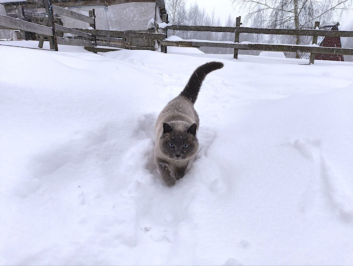 Я проснулась. Завываний ветра слышно не было. «Ну, если меня зря пугали этим снегопадом...» - подумала я. Но нет. Стоило выйти на улицу, и я убедилась: все в порядке. Как и предсказывали, нас заметает... Когда мы выходили на уборку, то отправили на улицу и козлов. Едва они переступили за порог, как сразу остановились и с недоумением оглянулись на нас: «Что вы сделали за ночь с погодой?!». Вокруг было белым-бело, а снег залеплял глаза. Следы от открывания двери заметало практически сразу. И это возле дома, который находится под защитой деревьев! «Можно обратно?» - спросили козлы, почти синхронно развернувшись и попытавшись прорваться назад в коридор. - Нет, идите и живите эту жизнь такой, какая она есть! – сказала я, подтолкнув Рогалика на улицу и решительно закрыв за ним дверь. Выбора у козлов не оставалось, и им пришлось отважно, но очень быстро добираться до своего домика. Снега за все время навалило столько, что у нас уже частично заметены окна на первом этаже. Такое вот естественно