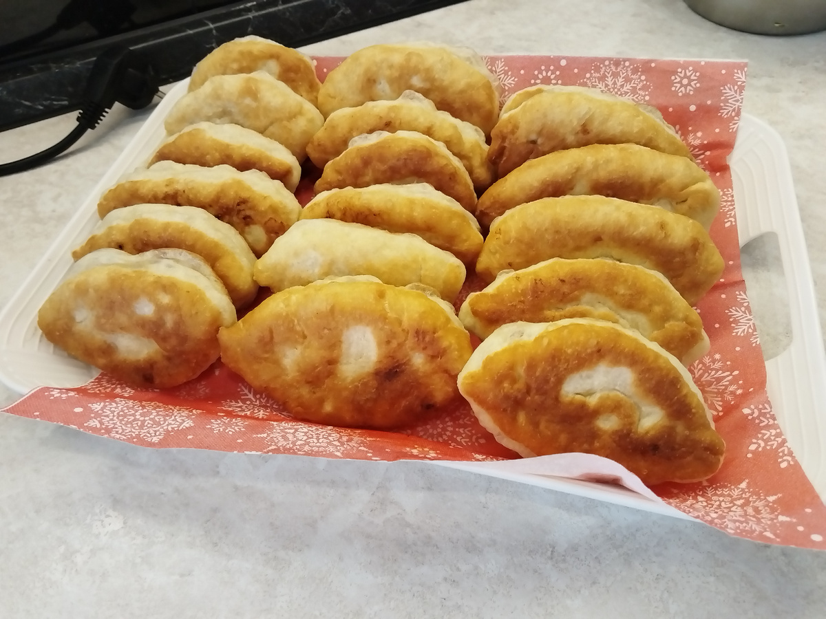 Постное блюдо из дрожжевого теста **Ингредиенты:** - Тесто: мука пшеничная — 500 г, дрожжи сухие — 7 г, тёплая вода — 250 мл, сахар — 1 ч. л., соль — 0,5 ч. л., масло растительное — 3 ст. л. - Начинка: картофель — 3–4 шт., лук репчатый — 1 крупная головка, соль и перец — по вкусу, масло для обжаривания. - Для фритюра: масло растительное — 150–200 мл. **Приготовление:** 1. **Тесто:** В глубокой миске смешайте воду, сахар и дрожжи. Оставьте на 10 минут, чтобы дрожжи «оживились». Добавьте масло, соль и постепенно вводите муку. Замесите мягкое тесто, слегка липкое. Накройте полотенцем и оставьте в тёплом месте на 1–1,5 часа. 2. **Начинка:** Картофель очистите и отварите до готовности. Разомните в пюре. Лук мелко нарежьте и обжарьте до золотистого цвета. Смешайте лук с картофелем, добавьте соль и перец. 3. **Формовка:** Подошедшее тесто разделите на равные части. Каждую часть раскатайте в лепёшку. Выложите начинку и аккуратно защипните края. Сформируйте продолговатые пирожки. 4. **Обжариван