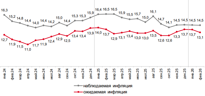 Одновременно с этим наблюдаемая инфляция остаётся на уровне 14,5% уже четыре месяца подряд. Таковы результаты опроса «инФОМ», проведенного по заказу Банка России. Источник: Банк России В феврале инфляционные ожидания россиян опустились до 13,1% (самый низкий показатель с октября). Одновременно с этим наблюдаемая инфляция осталась на уровне 14,5% четвертый месяц подряд. Таковы результаты опроса «инФОМ», проведенного по заказу Банка России 4—13 февраля среди 2000+ респондентов в 100 населенных пунктах в 54 субъектах РФ. В группах респондентов, которые имеют и не имеют сбережений, наблюдаемая инфляция показала разную динамику, опустившись до 12,9% в первом случае и поднявшись до 16,0% (максимум с сентября) во втором. Источник: Банк России Инфляционные ожидания в этих группах изменились однонаправленно, снизившись до 11,5% (минимум с октября) и до 14,2% соответственно. Источник: Банк России Доля участников опроса, которые не имеют финансовой «подушки» безопасности, резко выросла до 65% с 5