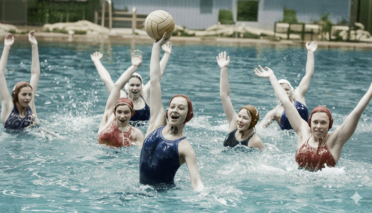 Групповой снимок с настроением спортивного кружка или секции: девушки в одинаковых темных купальных костюмах и шапочках сидят на бревне, вытянув ноги, а рядом виден мужчина, как будто тренер или организатор. Тут нет парадной дистанции, скорее дружеская пауза, когда команда уже “своя” и можно позволить себе улыбку в объектив. Вокруг угадывается спортивная площадка, простые конструкции, открытое пространство, типичный дух 1930-х.