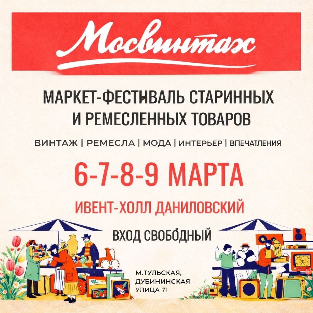 Друзья, с 6 по 9 марта приглашаем вас на большой весенний фестиваль «Мосвинтаж» в ивент-холле «Даниловский». Четыре дня, свыше двухсот участников и тысячи уникальных находок! Под одной крышей соберётся всё, что мы любим: антиквариат и винтаж XIX–XX века, утончённый фарфор и стекло, редкие книги, предметы быта и детали интерьера. Особое внимание - моде. Наряды, украшения, сумки и аксессуары, из которых рождаются образы и настроение. В программе лекторий Мосвинтаж, где поговорим о моде, культуре и городской истории, а также показ винтажной моды, вдохновлённый стилем прошлых эпох. 📅 6–7–8–9 марта 📍 Москва, ивент-холл «Даниловский» ул. Дубининская, 71 (м. Тульская) 🎟 Вход свободный 🚗 Для автомобилистов есть парковка — 300 ₽ в день Мосвинтаж : исследуем прошлое, чтобы черпать вдохновение для настоящего.
