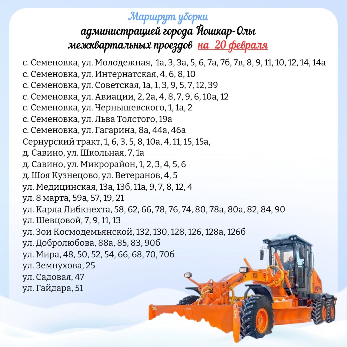 ❄️ Завтра, 20 февраля, запланированы работы по очистке межквартальных проездов